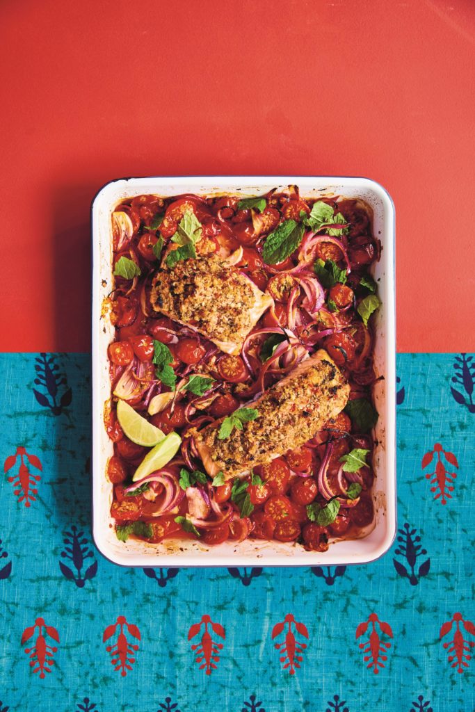 “Als je deze Zuid-Indiase smaakmaker (een mengsel van kokos, chilipeper, munt, knoflook en limoen) een keer geprobeerd hebt, ga je hem overal op gebruiken: witte vis, kip, paneer, gebakken groenten… Hier krijgt de zalm er een lekker korstje van en worden de tomaten en ui er ook mee op smaak gebracht. Een fijne, snelle eenpansmaaltijd.”