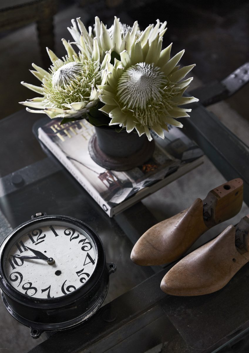Vanaf het begin wist Charlotte – die vóórdat ze de overstap naar interieurontwerper maakte werkzaam was als stylist op film- en reclamesets – welke look-and-feel elke ruimte moest krijgen. Geborgen, met respect voor het verleden, maar ook een knipoog naar nu. En dankzij haar vroegere ervaring in het vinden van de juiste rekwisieten beschikte ze over een zwart boekje met dé adressen voor bijzondere schatten. Zoals Onsite Gallery in Kaapstad (zie @onsitegallery), waar ze haar salontafel vond: een oude kruiwagen met daarbovenop een glazen plaat. “Ik heb altijd een zwak gehad voor items met een geschiedenis. Niet alleen vanwege het vakmanschap, spullen werden vroeger gewoon veel beter gemaakt, maar ook omdat ik het heerlijk vind om erover na te denken van wie het geweest is, en hoe die persoon ermee omging.” Ze is dan ook een trouwe klant van Milnerton Market, een van de beroemdste weekendvlooienmarkten van Kaapstad, waar ze een deel van de vintage portretten vond die nu in het trappenhuis hangen.