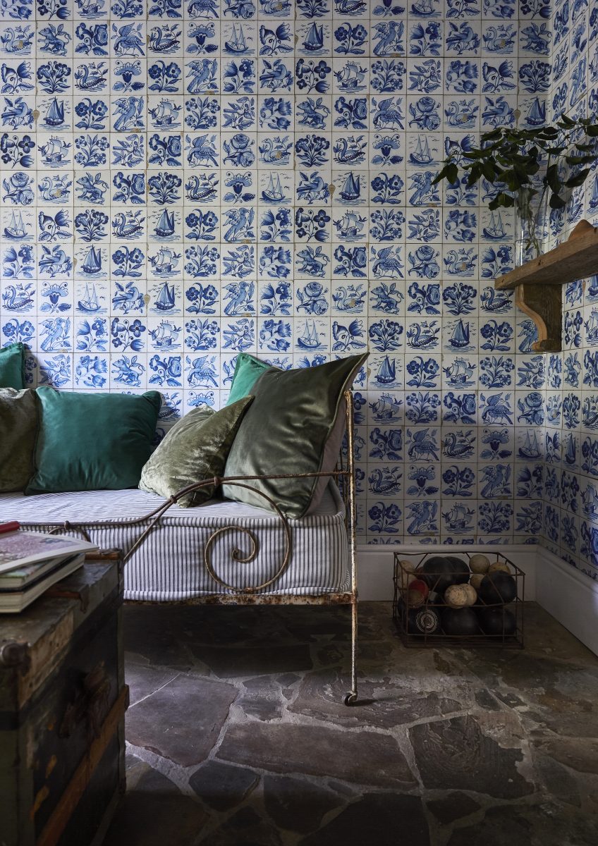Het Delfts blauwe behang is van Cara Saven. Charlotte: “Dit was eerst een rommelhok, nu een favoriet toevluchtsoord.”