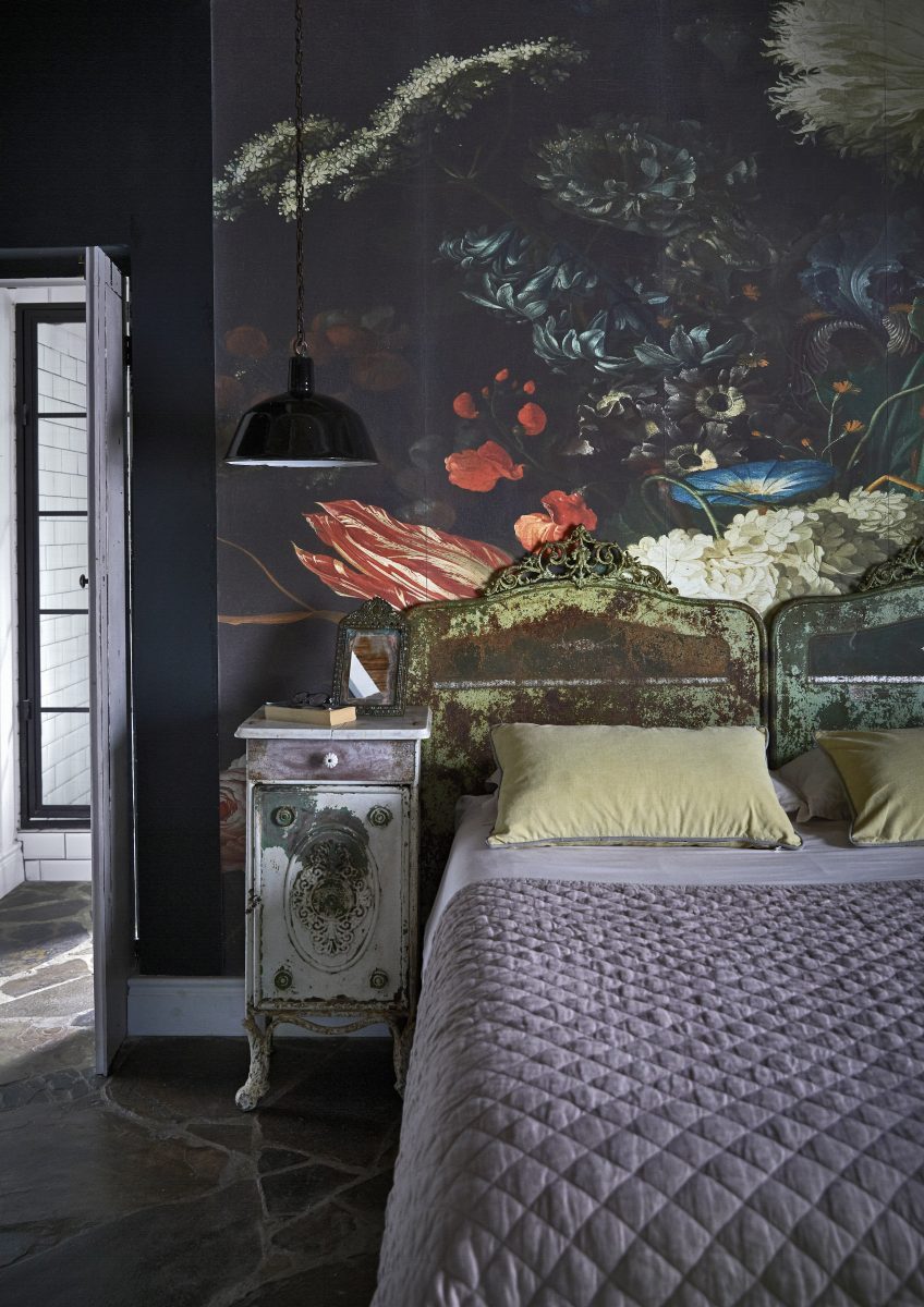 Voor het hoofdeinde laste Charlotte twee oude boerenbedden aan elkaar. Het behang komt uit Engeland. Via ixxiyourworld.com vind je vergelijkbare wanddecoraties.