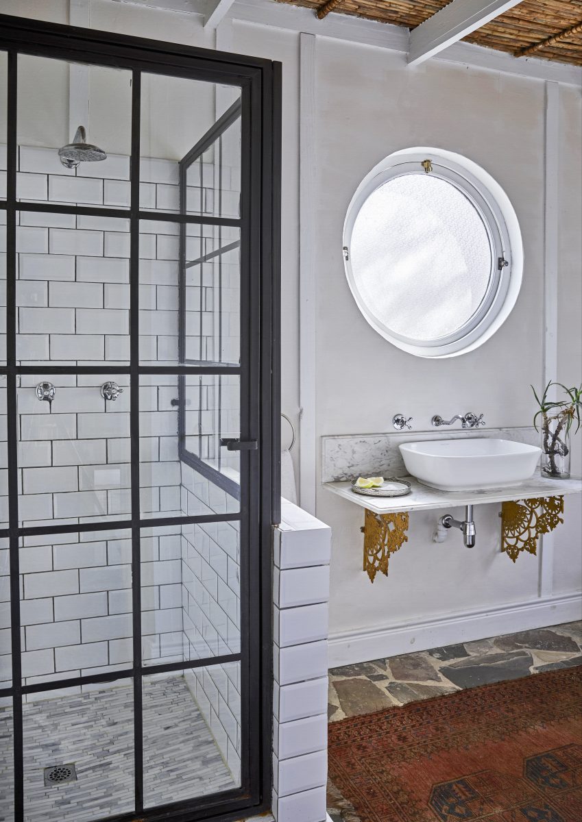 Trots is ze op het kleine kamertje dat in het begin niet meer dan een rommelhok was, maar ze heeft geüpgraded tot een gezellige plek waar je je heerlijk kunt terugtrekken met een goed boek. “Veel mensen denken dat dit echte Delfts blauwe tegeltjes zijn, maar het is behang van Cara Saven. Je kunt bij haar allerlei prints op maat bestellen, van botanische afdrukken tot fotobehang van een complete boekenkast.” Blij is ze ook met de keuken waarvoor ze een prachtige antieke werkbank vond bij Koöperasie Stories in Simondium bij Paarl. De ‘serviesplanken’ erboven maakte ze zelf van oud metaal. Sowieso heeft ze een zwak voor dit rauwe materiaal, vooral als het oxideert. Ze upcyclet het tot verrassende nieuwe meubels: zo laste ze twee enkele ‘boerenbedden’ uit Polen aan elkaar en maakte hiervan het hoofdeinde van het bed in de slaapkamer beneden. Nog meer ideeën: in de badkamer toverde ze een oude tafel met marmeren blad om tot spiksplinternieuw wasmeubel en ‘broekie-lace’ – sierlijk ijzerwerk afkomstig van victoriaanse huizen – hergebruikte ze als drager voor de wastafel. Een perfecte combi met de strakke zwartstalen douchecabine.