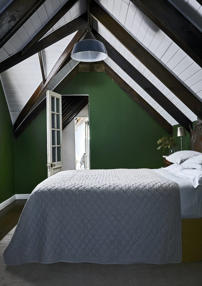 Net als de ‘nieuwe’ trap is ook de houten paneelwand achter de open haard in de woonkamer door haarzelf aangebracht. “Iedereen denkt dat die wand er altijd al heeft gezeten. Ik zocht iets wat de ruimte nog intiemer zou maken en kwam op dit idee.” De perfecte tint groen vinden was lastig. “Ik had tien testpotten verf in huis. Toen ik het laatste blik openmaakte, dacht ik: dit gaat ’m ook niet worden. Gefrustreerd verfde ik toch een strook. En concludeerde dat deze tint groen, Plascon Time and Again G1-C1-4, preciés de goede kleur was.”