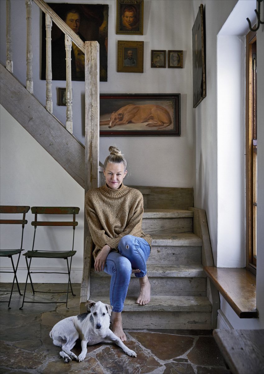 De trap lijkt origineel, maar Charlotte maakte hem zelf van oud hout. Oiley, haar 18-jarige hond uit het asiel, is altijd in de buurt.