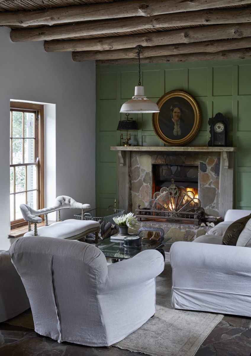 Van een authentieke cottage vlak bij Kaapstad maakte interieurontwerper Charlotte Collins een cosy buitenverblijf vol antieke meubels en vintage metaal als verrassende eyecatcher. Statige portretten die doen denken aan oude meesters en behang met een Delfts blauw patroon zijn een knipoog naar het Hollandse verleden hier.