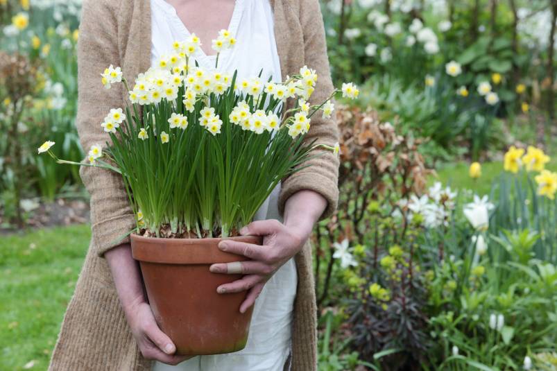 Hoe ben je beland op dit mooie landgoed? “Landgoed Den Treek-Henschoten is een familielandgoed aan de rand van Leusden. De eigenaar zocht in 2002 een nieuwe beheerder. Wij woonden destijds met veel plezier in Delden op Landgoed Twickel, waar mijn man Martin werkzaam was. Ons huis hadden we in tien jaar tijd helemaal zelf verbouwd. Dat geef je niet zo makkelijk op. Maar toen we deze plek zagen, was het direct raak. Hier hing dezelfde landgoedsfeer als op Twickel.” Hoe zag de tuin er zeventien jaar geleden uit? “Er was helemaal geen tuin! Rondom het huis lag gras en er stonden hier en daar wat coniferen. Voor mij en Martin een mooie uitdaging dus. Op Twickel lagen de borders als een warme deken om ons huis. Dat effect wilden we hier ook weer bereiken. En dat is gelukt: vanuit elke kamer kunnen we de tuin beleven. Vooral in de lente is dat een feestje. Terwijl ik die eerste jaren helemaal niet zo gericht was op het voorjaar. Daar was ik veel te druk voor. Bovendien was ik geen bollenmens. Maar kweekster Dicky Schipper wist me te enthousiasmeren. In het najaar van 2012 plantte ik drieduizend bollen aan. Allemaal witte en gele soorten om aan te sluiten bij de kleuren van het huis. Zachtgele narcissen en tulpen, witte anemonen en zomerklokjes, donkergele keizerskronen. Dat eerste voorjaar hadden we een zee van bloemen tussen alle bloeiende sierappelboompjes. Het totaalbeeld was zó mooi! Sindsdien gaan hier elk najaar weer duizenden bollen de grond in.”