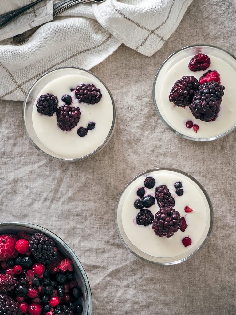 - Laat in 5-6 uur (of een nacht) opstijven in de koelkast en verdeel vlak voor het serveren de bramen erover.