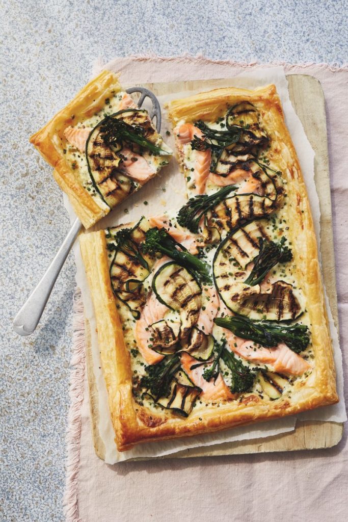 Plaattaart met zalm, courgette en bimi