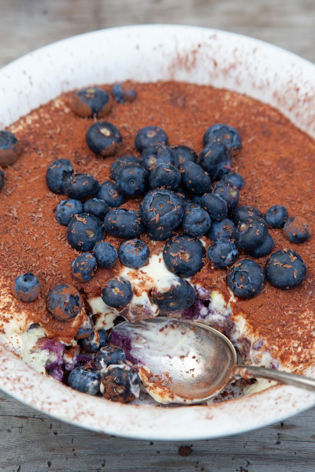 - Zet de tiramisu afgedekt in de koelkast. Haal ’m er een uurtje voor je hem serveert uit. Bestrooi met cacaopoeder en wat geraspte chocolade en leg er verse blauwe bessen op.