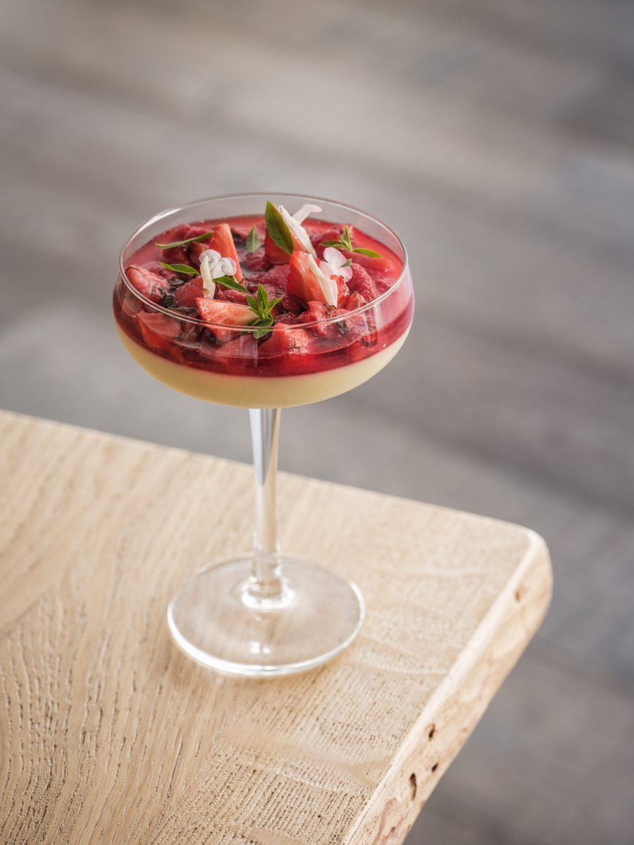 Panna cotta met aardbei, citroenverbena en Hot Lips