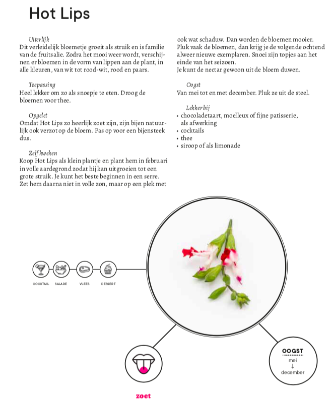Met zijn boek wil Van Steenkiste een inkijk geven in de wereld van de meer unieke kruiden – dus niet bijvoorbeeld het gangbare tijm en bieslook. Zoals hij zelf schrijft, ‘Kruiden zijn smaakmakers en bovendien eindeloos divers. Of je er nu soep van maakt of salades, ze infuseert in olie, oplegt in azijn of rookt op de barbecue: kruiden geven elk gerecht een eigen smaak en unieke smoel. En in combinatie met eetbare bloemen worden ze helemaal een lieve lust voor het oog.’ In Herbas lees je hoe je zelf kruiden kunt zoeken, vlakbij huis, en hoe je ze kunt planten. Van Steenkiste stipt per seizoen kort aan wat de kruidentuin op dat moment schaft, en hoe je je handen uit de mouwen kunt steken. Per kruid en bloem geeft hij een handig overzicht van de toepassing, oogst – en waar het lekker bij smaakt. Uiteraard bij de oogstrelende gerechten van de diverse Vlaamse chefs, zoals deze panna cotta.