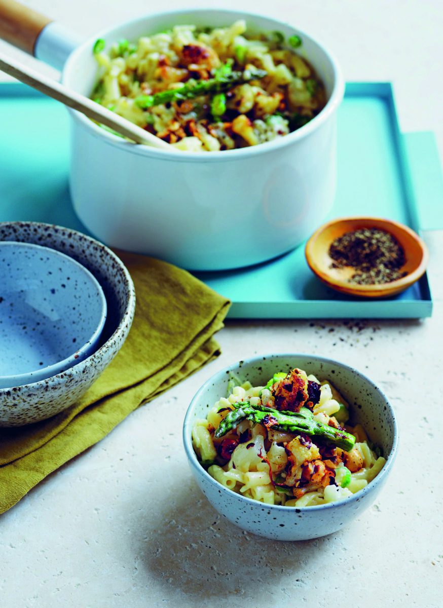 Zeg je Macaroni met ham en kaas, dan denk je niet direct aan groenten. Maar Alice Zaslavsky maakt een heerlijke variant van deze klassieker, met een hoofdrol voor asperges. Win-win als je het ons vraagt… Alice over haar ‘Double denim Mac ‘n’ Cheese’: ‘Weet je nog dat toen Justin en Britney aan het daten waren ze samen naar de MTV Video Music Awards gingen in hun spijkeroutfit? Nou kijk, door zijn kapsel (wat toch verdraaid veel op een bak macaroni leek) en haar achternaam (Spears, asperges, snap je ’m?), kwam ik tot dit gerecht. Vaak zijn mac ‘n’ cheese-recepten ronduit teleur- stellend omdat je te veel handelingen moet verrichten (ik heb het tegen jou, bechamelsaus), dus wat ik leuk vind aan dit recept, is dat het net zo snel klaar is als het koken van een pan met pasta. Als je geen tijd hebt om je druk te maken over het koken van de groenten, hak de asperges dan in kleine stukjes en doe ze in een vergiet vlak voordat je het pastawater erdoorheen laat lopen; dit zal de asperges net voldoende garen, zodat ze niet meer knalhard zijn. Of rasp een deel van de bloemkool door de gekookte pasta vlak voor je het vuur uitdraait en de pasta afgiet. Een handje of twee bevroren erwtjes in een kom doen en er kokend water overheen gieten, is een andere optie.’