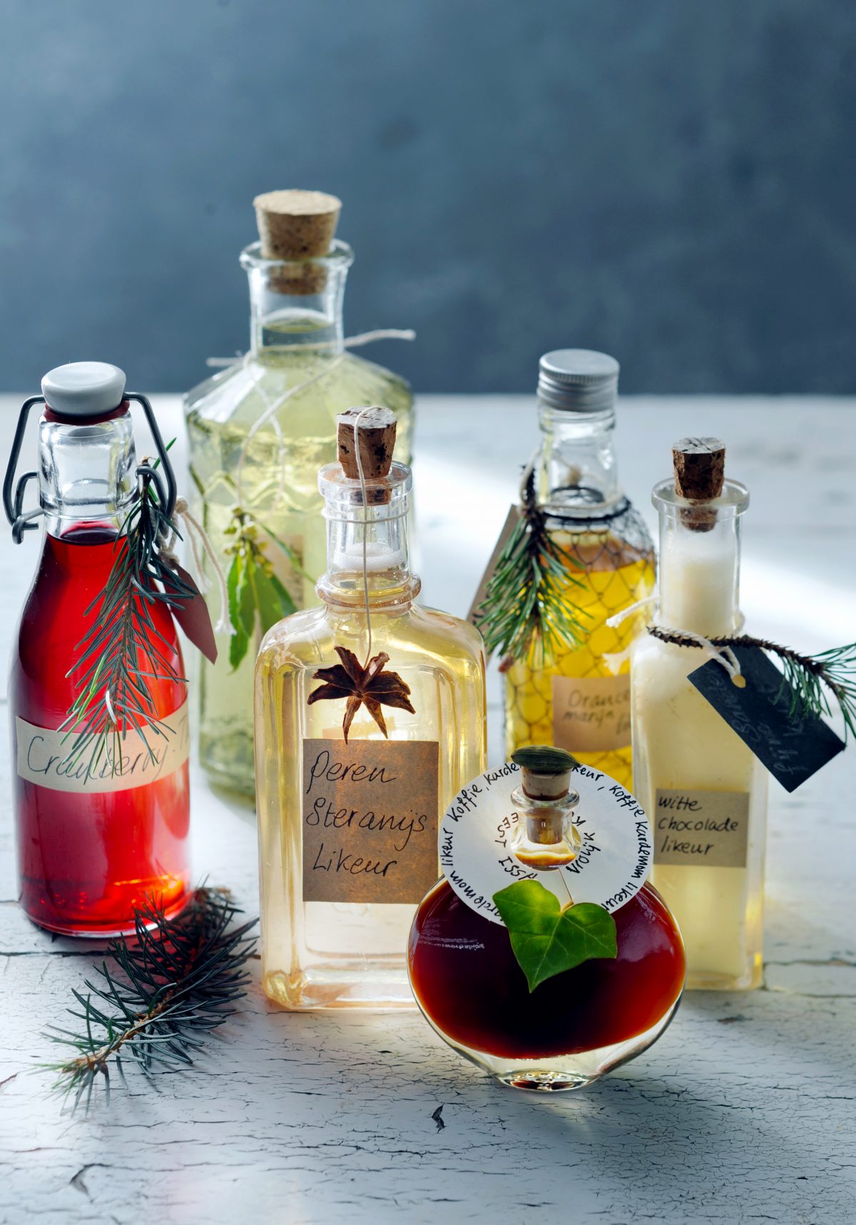 De basis voor elke likeur is sterke drank. De uitgesproken smaken van de overige ingrediënten lossen op in de alcohol en het water. Wie vooral de ingrediënten wil proeven, kan het beste een dranksoort kiezen met een relatief neutrale smaak zoals wodka of brandewijn. Wie voor extra smaak gaat, kiest voor een alcoholische drank met een eigen karakter zoals gin, whisky of rum. CREDITS: FOTOGRAFIE ERIC VAN LOKVEN | STYLING JET KRINGS | RECEPTEN DOSIA BREWER
