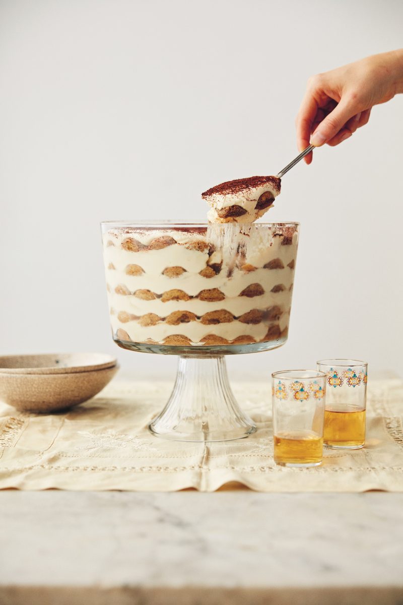 Clark schrijft over dit tiramisù recept: “Tiramisù werd ooit bedacht in Treviso en is nu populair in heel Italië. En met een goede reden: dit is het perfecte troostdessert. Ik maak die van mij graag in een gratineer of trifleschaal om er grote scheppen van te kunnen serveren, in plaats van individuele porties. Als je het gerecht in een grote trifleschaal wilt maken, zoals op de foto, verdubbel je gewoon de hoeveelheden.”