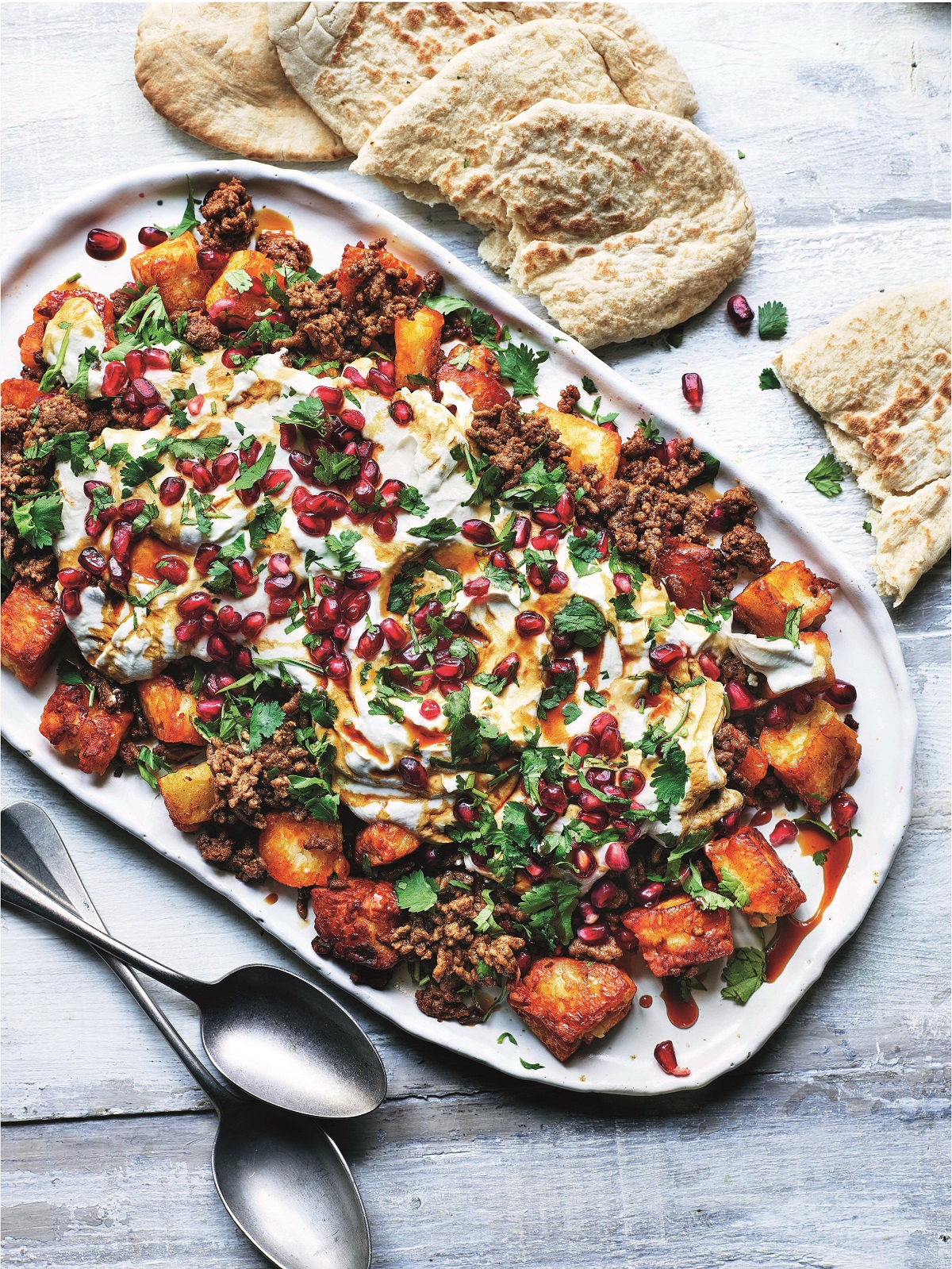“Ik combineer graag ingrediënten uit verschillende culturen. Halloumi wordt veel gegeten op Cyprus en fatteh is een Arabisch recept, maar als twee dingen zo ongelooflijk lekker zijn, kan ik de verleiding niet weerstaan om ze toch samen te voegen: krokante, zoute halloumi met daarop gekruid rundergehakt en tahinyoghurt. Verdubbel de hoeveelheden als je zin hebt om dit te delen en zorg dat je wat geroosterd pitabrood bij de hand hebt om alles bij elkaar te brengen en tot de laatste kruimel op te peuzelen.”
