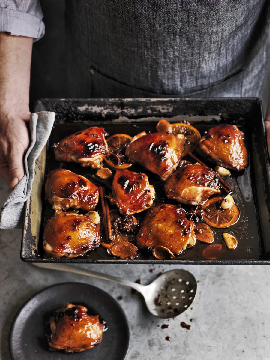 - Meng de Sichuan peper, steranijs, kaneelstokjes, gember, knoflook, sinaasappelsap, ketjap, sojasaus en wat peper en zout in een grote kom. Voeg de kippendijen toe en schep om tot ze aan alle kanten bedekt zijn met het mengsel. Laat de kip 10 min. marineren.