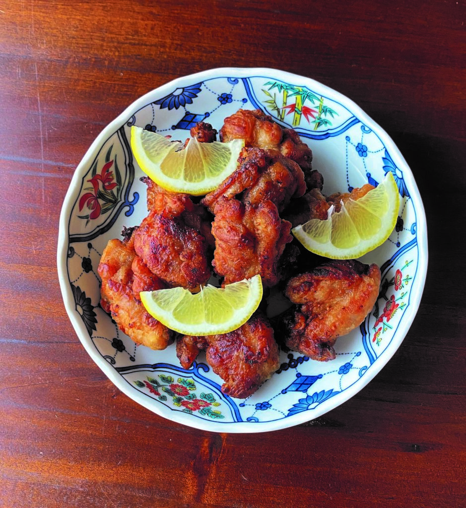 - Serveer de karaage in een mooie, lage schaal en garneer eventueel met citroen.