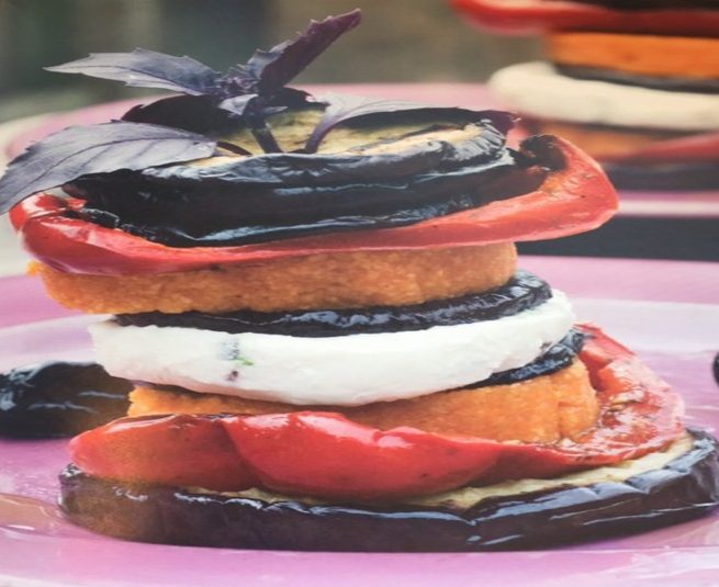 Gegrilde aubergine met tomatenpolenta en geitenkaas