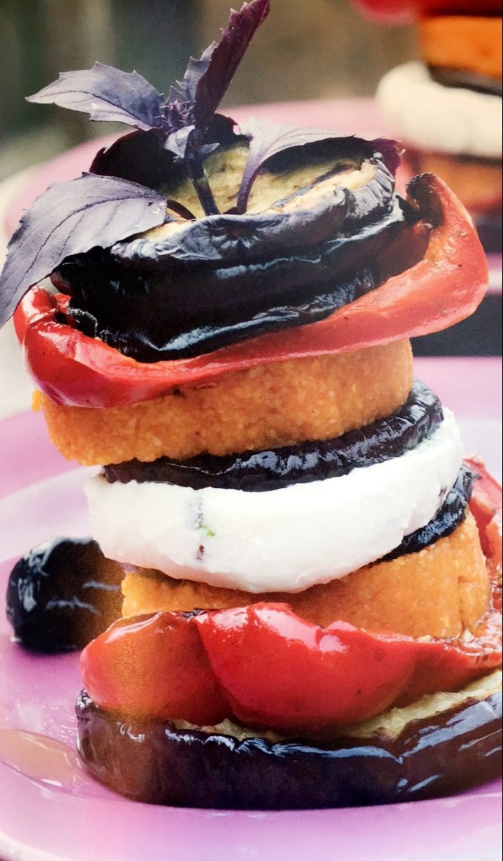 Een heerlijk vegetarisch voorafje, deze gegrilde aubergine met tomatenpolenta en geitenkaas. Ook leuk als origineel antipasto-gerecht bij de borrel!
