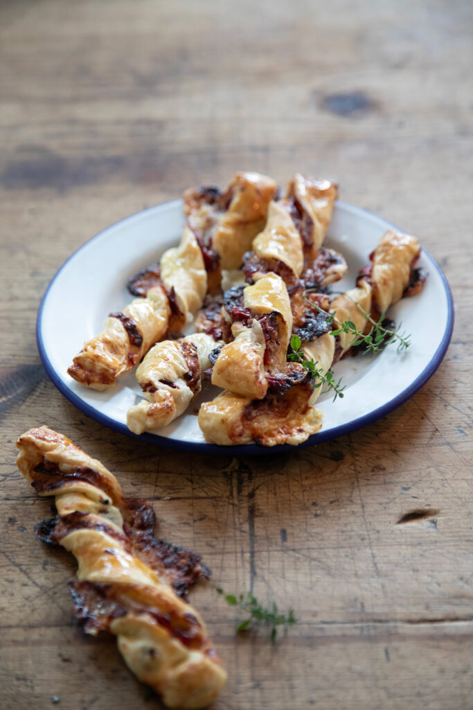 - Bestrijk het bladerdeeg met een dun laagje cranberrycompote. Leg op de helft van het deeg plakjes salami en bestrooi met geraspte kaas. Vouw het deeg dubbel en rol lichtjes uit. Snijd in repen, draai elke reep in een spiraal en leg ze op een met bakpapier beklede bakplaat. Bestrooi met zwarte peper en bak circa 15 minuten tot goudbruin.