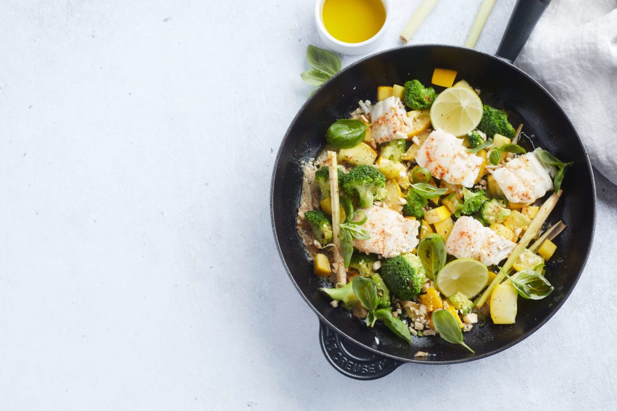 “Ben je ook gek op de Thaise keuken met al zijn pittige smaakmakers? Deze eenpansmaaltijd van groenten en vis met kokosmelk en citroengras is in een tiental minuten al voorbereid en een echte smaakbom. Ideaal als het snel mag gaan!”