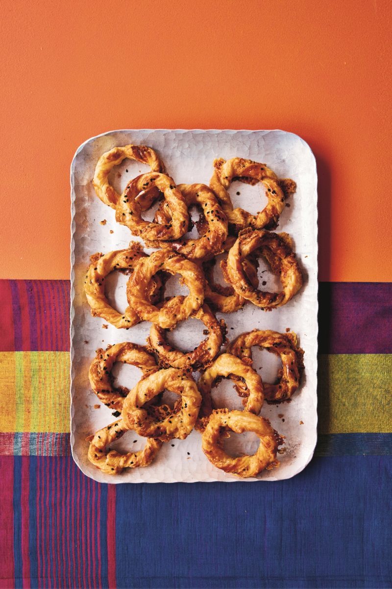 “Als je bladerdeeg in de vriezer hebt liggen, ben je nooit meer dan 30 minuten verwijderd van deze lekkere kaasringen. De vorm doet me denken aan mijn favoriete Zuid-Indiase snack, Murukku (een ander recept in dit boek, red), die mijn oma met de hand draaide en vormde. De smaakmakers zijn afkomstig van mijn meest favoriete Bengaalse snack ooit: nimki, verslavend lekkere bladerdeegachtige ruitjes met nigellazaad. Deze kaasringen zijn gevuld met nigellazaad, cheddar en komijnzaad om ze nog lekkerder te maken – probeer die zielig kijkende viervoeters te negeren.”