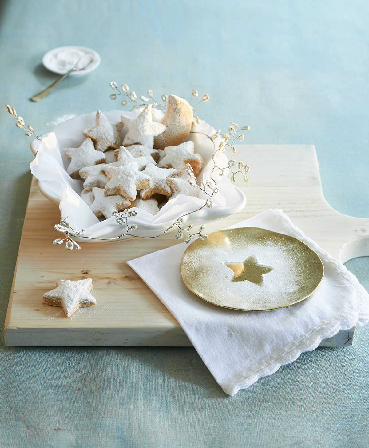 TEKST, RECEPTUUR EN BEREIDING DOSIA BREWER | FOTOGRAFIE DENNIS BRANDSMA | STYLING LINDA VAN DER HAM Plank € 20,95, Schaal met golvende rand € 24,96 (Loods 5). Servet, set van 4 stuks € 19,95, lepeltje € 1,95 (Zara). Bordje, set van 3 stuks € 39,95 (&Klevering). Slinger € 24,95 (De Weldaad). Schaaltje € 2,50 (Dille & Kamille).