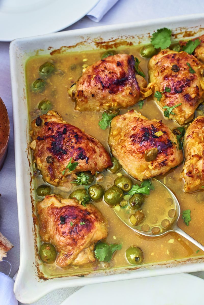 - Leg de stukken kip in een grote ovenschaal waarin ze goed naast elkaar kunnen liggen. Verdeel de kappertjes, olijven en gekookte citroenstukken ertussen en giet dan al het sap uit de schaal erbij. Bak de kip 1 uur in de oven tot deze bruin en helemaal gaar is.