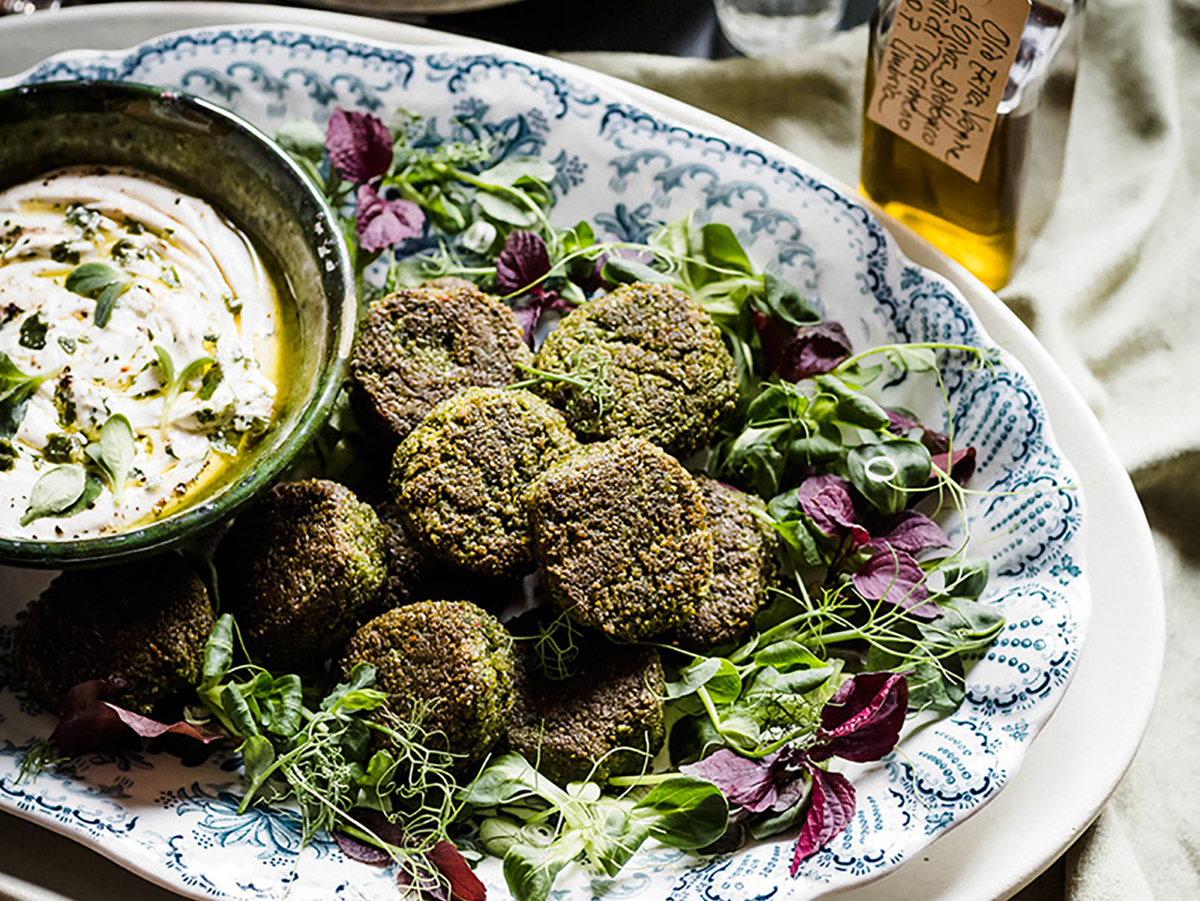 - Serveer de falafel met de kruidensalade en de erwtkiemen en geef er brood en tahin met bernagie-olie bij.