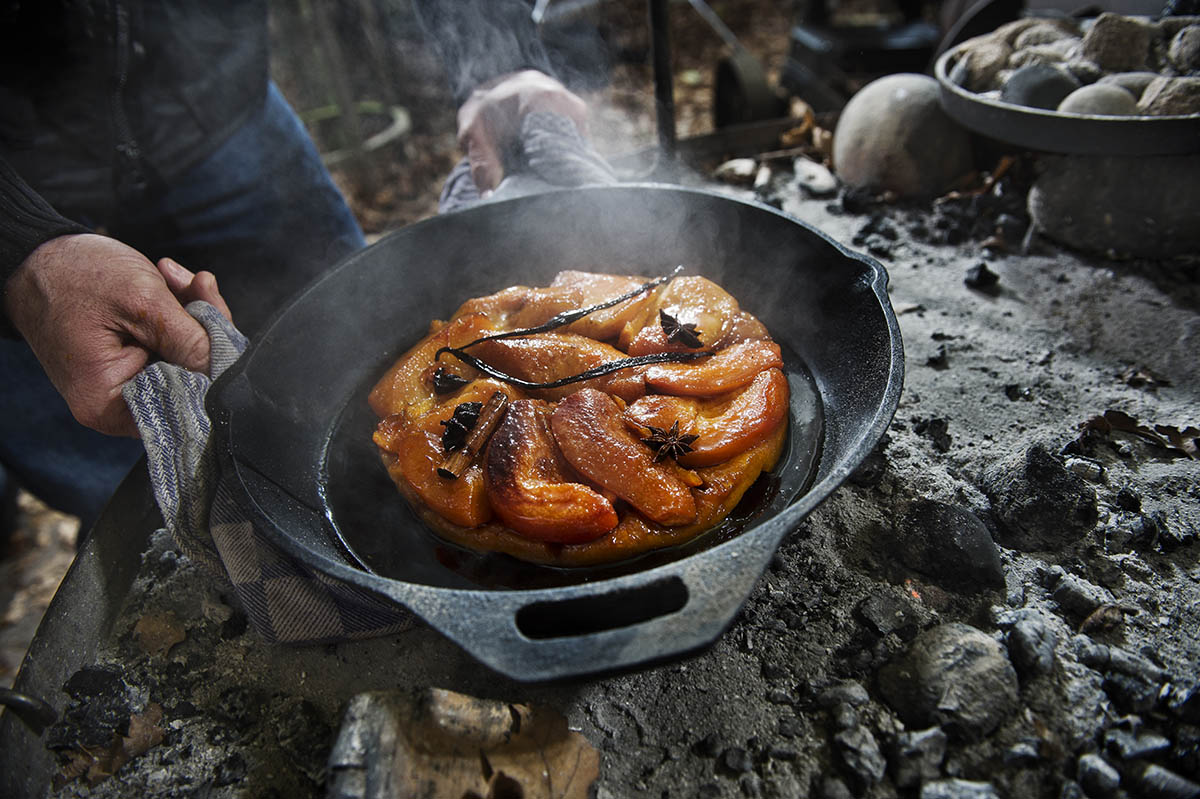 Wat gebeurt er als je een jonge bakker samenbrengt met een ervaren vuurspecialist in een buitenkeuken? Dan ontstaan de heerlijkste recepten, zoals deze tarte tatin van kweepeer met karamel. Lees de hele reportage met Efraïm Bolado van der Meij, Bakker van restaurant As in Amsterdam, en vuurspecialist Willem ter Steeg, ook wel Grijzebeer genoemd, in Seasons 1 van 2019. ‘Efraïm bedekt het fruit met pâte brisée: een soepel deegje voorzien van inkepingen. “Deze tarte tatin heeft juist warmte aan de onderkant nodig, want daar vormt zich de karamel.” De geuren van vanille, saffraan, kaneel en steranijs stijgen op uit de taartpan. De mannen krijgen trek. Grijzebeer: “Dit is de voorpret. Het water moet je in de mond lopen. Dat bevordert het spijsverteringsproces.”’