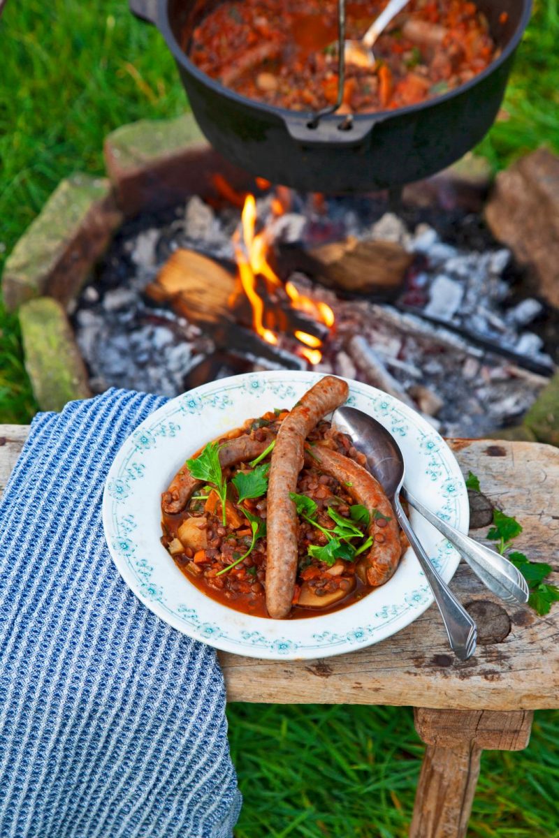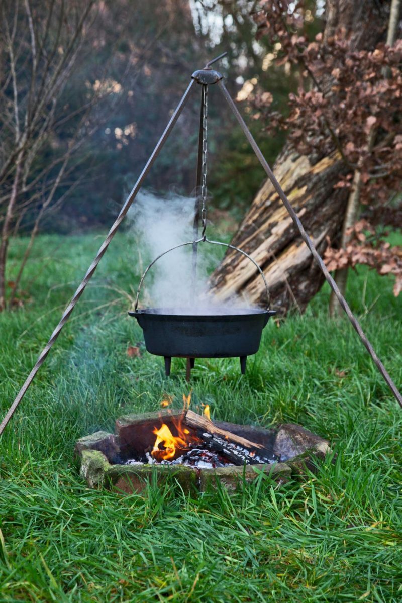 Wij maakten deze gerechten op een buitenvuurtje, maar omdat het weer zich daar niet altijd voor leent, zijn de recepten geschreven op ‘gewone’ bereiding, dus op een fornuis en in de oven. Wil je buiten koken? Maak dan een vuur van houtskool of briketten of een mix daarvan. Met briketten is de warmte het best te sturen, omdat ze gelijkmatiger branden. Voor alle kookvuurtjes geldt: langzaam garen is de truc. Zorg dat de kolen gloeien, maar stook het vuur niet te hoog op. De beste gaarplek is meestal langs de rand van het vuur, waar het net iets minder heet is. De pan op de foto’s is een Dutch oven, een gietijzeren pan die werkt als een oven door hem met gesloten deksel op de hete kolen te zetten. Op het deksel met opstaande rand kun je gloeiende briketten leggen voor extra bovenwarmte. Hang je de pan aan een driepoot, zorg dan voor een knapperend, niet al te hoog vuurtje, zoals op de foto hierboven.