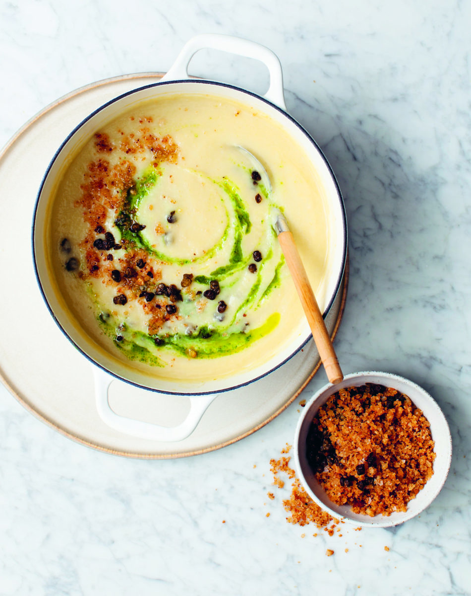 - Serveer de soep met een handjevol krokante kruimels en kappertjes.