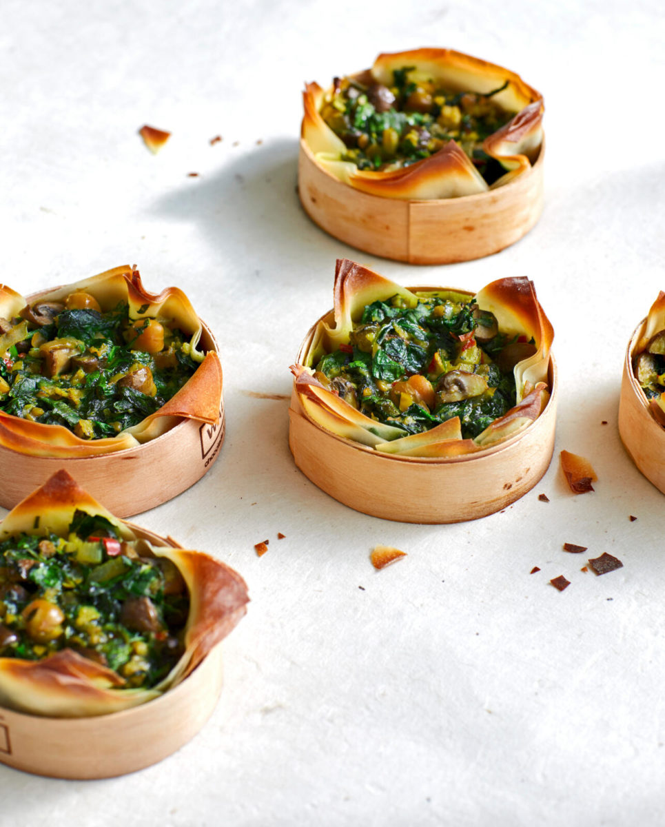 - Vis de citroenbladeren uit de wok en schep de spinazievulling in de filodeegvormpjes.