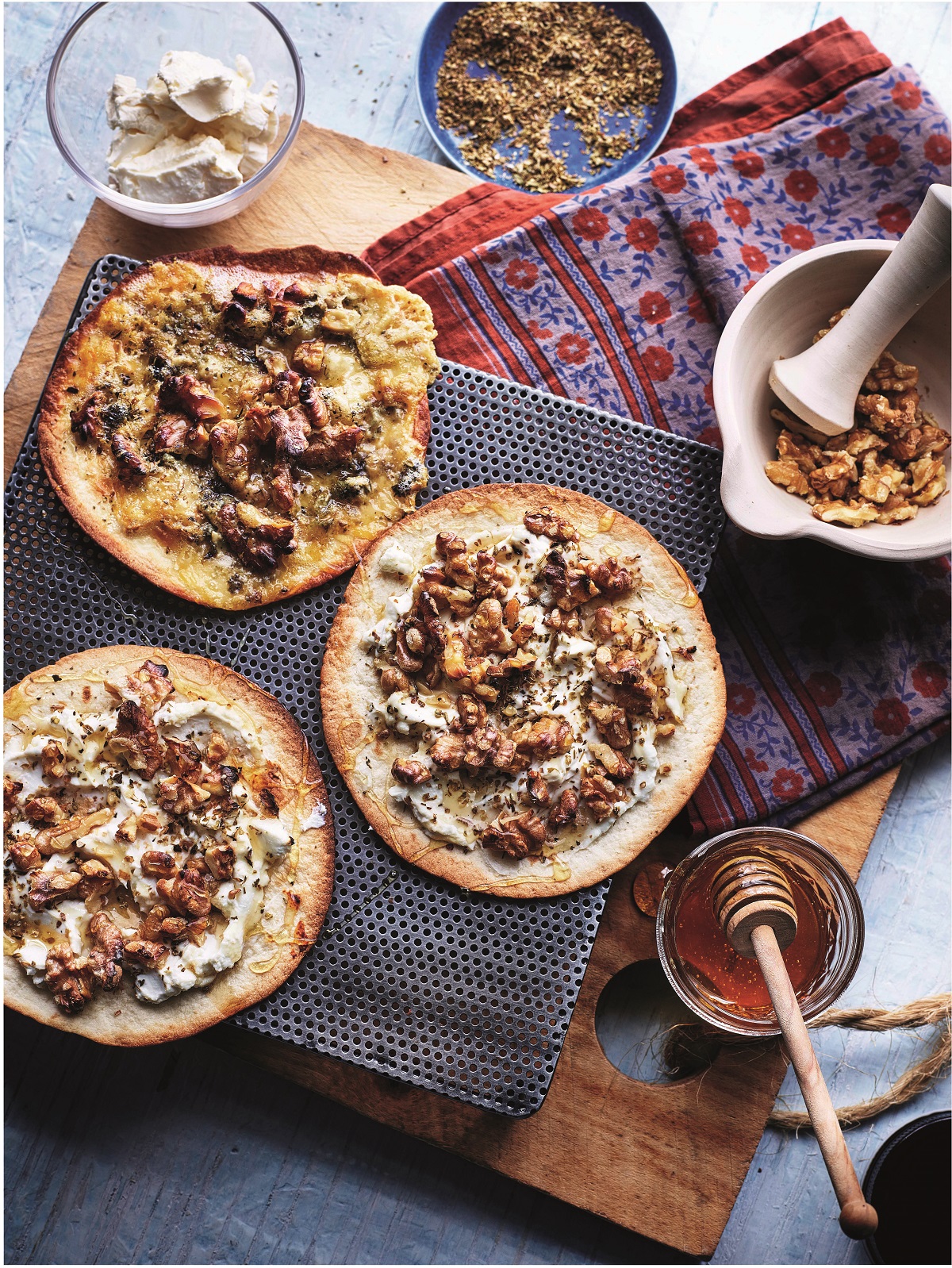 Je kunt platbrood zelf bakken, maar daar moet je wel tijd voor (en zin in) hebben. Een kant en klare tortilla kun je ook omtoveren in dit lekkere platbrood met kaas, tijm, walnoten en honing. Het is een van de recepten uit het pas verschenen kookboek ‘Persiana elke dag’ van Sabrina Ghayour.