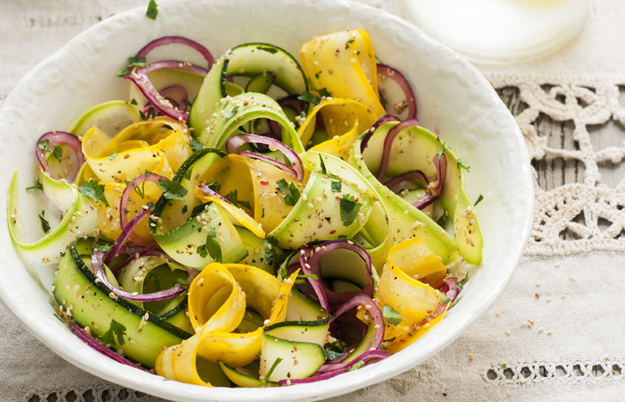 - Schep de courgetterepen door de dressing en schik ze samen met de ui in een kom.
