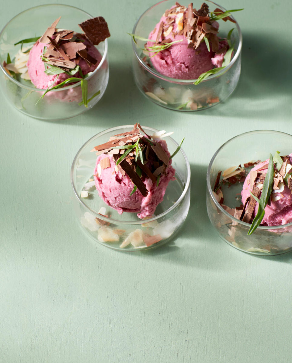 - Schep ijsbolletjes in schaaltjes, strooi de geschaafde amandelen en een klein beetje dragon over het ijs en bestrooi met nog wat geschaafde chocolade.