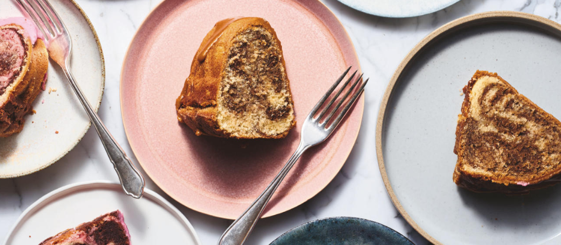 - Schep de drie mengsels in zes afwisselende lagen in de voorbereide vorm, twee lagen van elke kleur, ga met een spies of een dun men in zigzagvorm door het beslag zodat er een gemarmerd patron ontstaat. Doe dat niet te lang, dan verdwijnt het marmereffect.