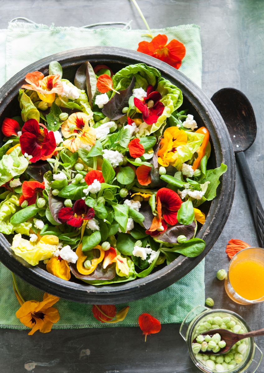 De Oost-Indische kers (Tropaeolum majus) is een elegant rankende plant, die de hele zomer tot in de herfst doorbloeit. De felgekleurde bloemen zijn een lust voor het oog in salades en hebben een peperige smaak, zo ook in deze salade met paprika en geitenkaas.