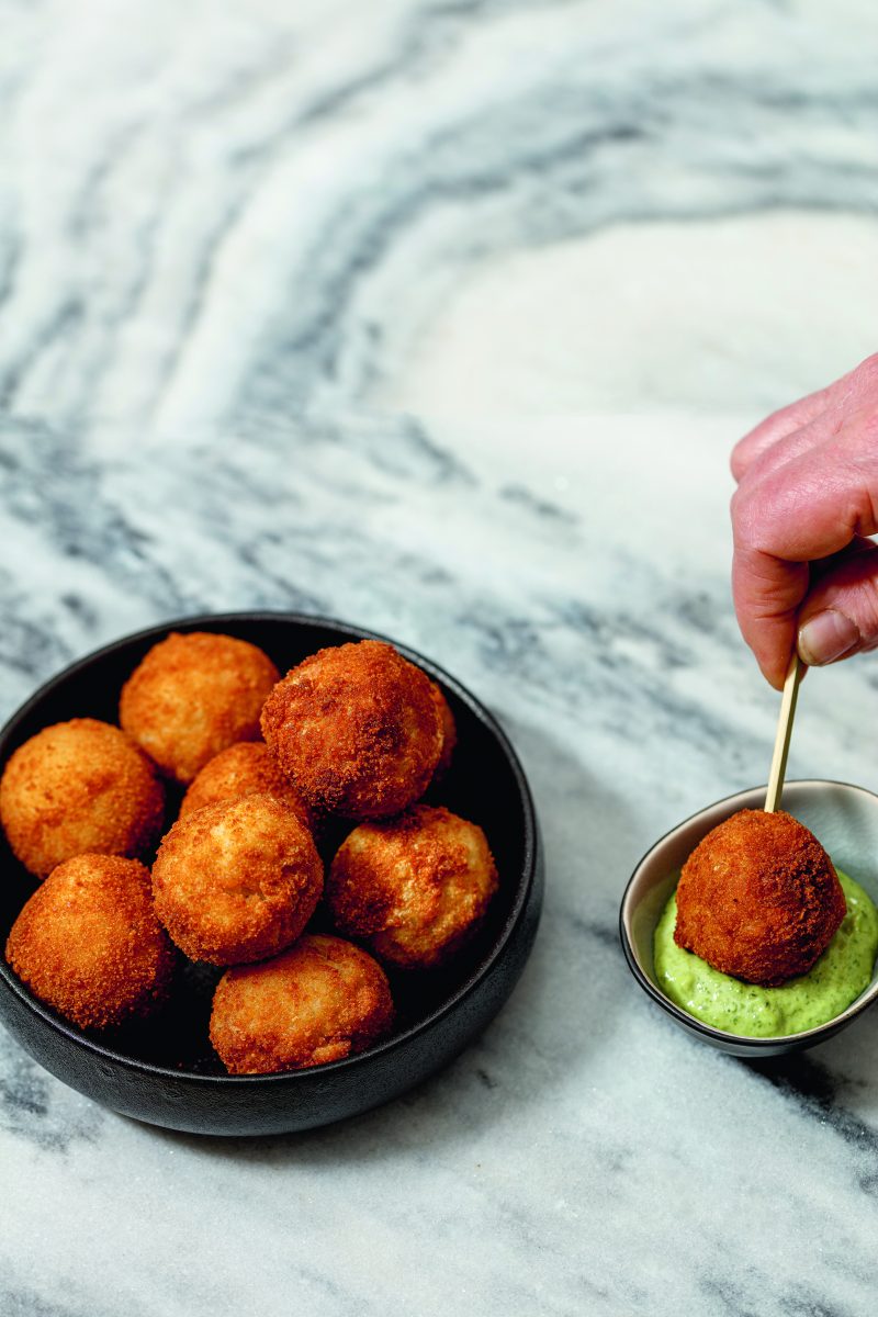- Schep de balletjes in de pan, eventueel in twee porties, en bak ze in ongeveer 5 minuten goudbruin. Laat uitlekken op keuken papier. Serveer met de basilicummayonaise.
