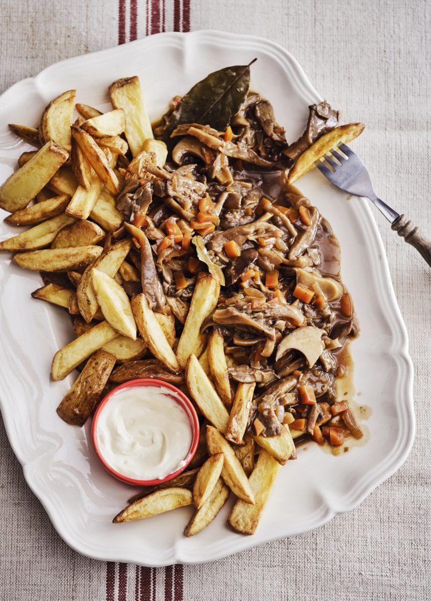 - Verdeel de stoof over de borden samen met de Vlaamse frieten en serveer het patatje stoofzwam met mayonaise.