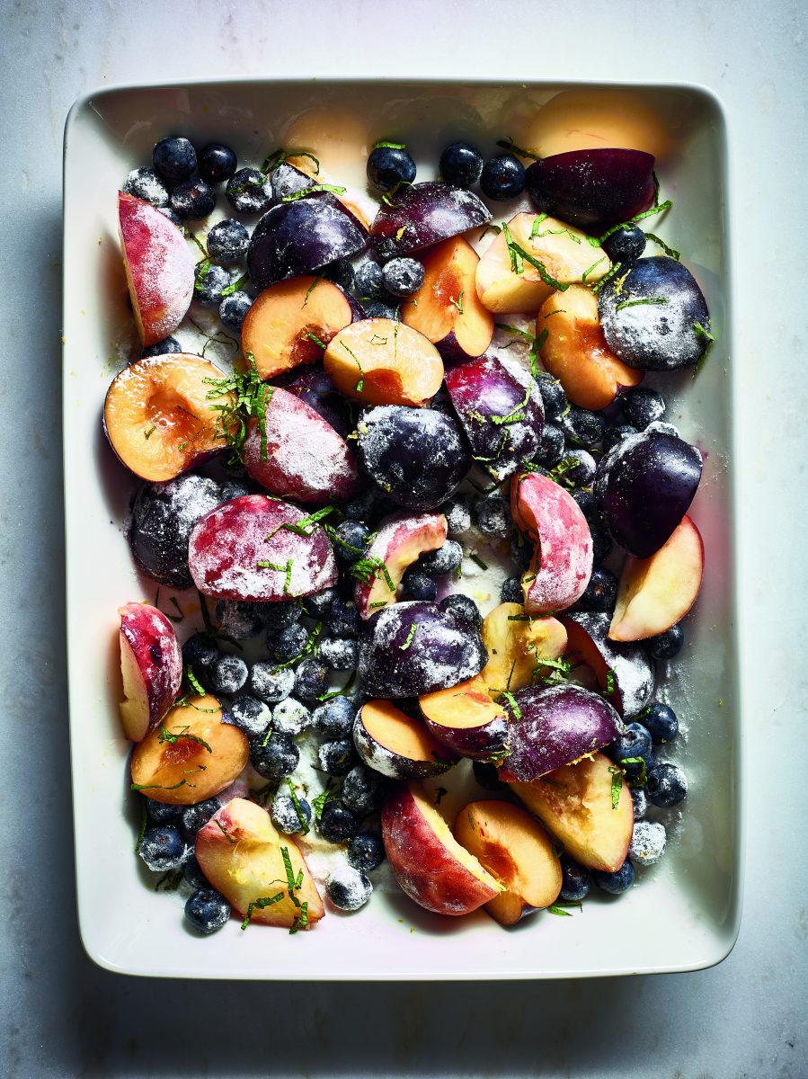 - Snijd de pruimen en perziken in kwarten, verwijder de pitten en doe het vruchtvlees in een grote kom. Strooi de suiker en maïzena erover en hussel alles goed door elkaar. Giet het fruitmengsel in de geprepareerde slede en spreid het in een egale laag uit. Strooi de blauwe bessen en geraspte citroenschil er gelijkmatig op. Strooi ten slotte de gehakte munt erop en druk de blaadjes er een beetje in, zodat ze tijdens het bakken niet verbranden.