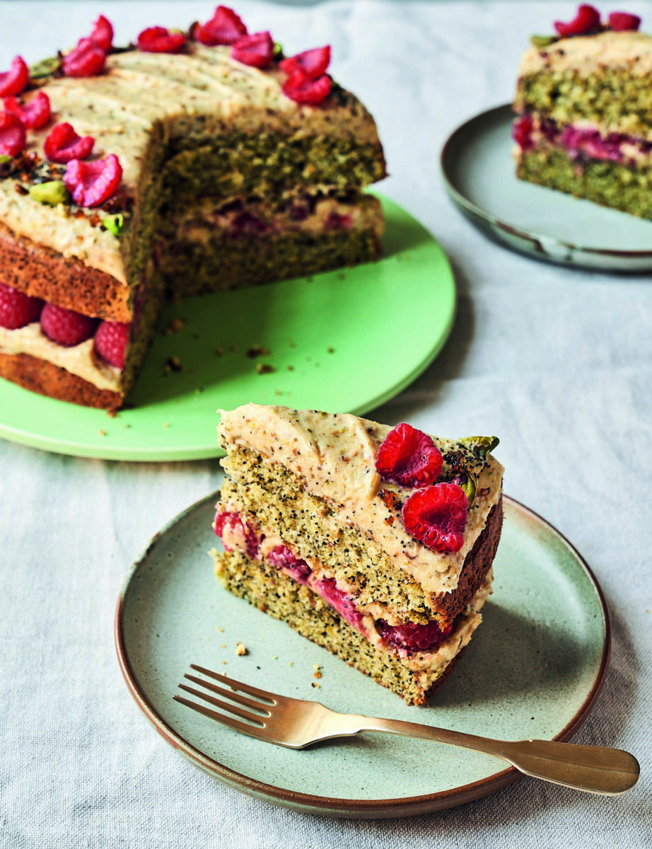 “In deze prachtige taart, die bestaat uit twee lagen, vormen knapperige pistachenoten, maanzaad en frisse frambozen een fantastische combinatie. Ik ben dol op pistachenoten en hier zitten ze in de vulling, in de pralinékaramel en in de cakelagen. Verrukkelijk in combinatie met maanzaad. Kortom, gewoon een heerlijke taart!”