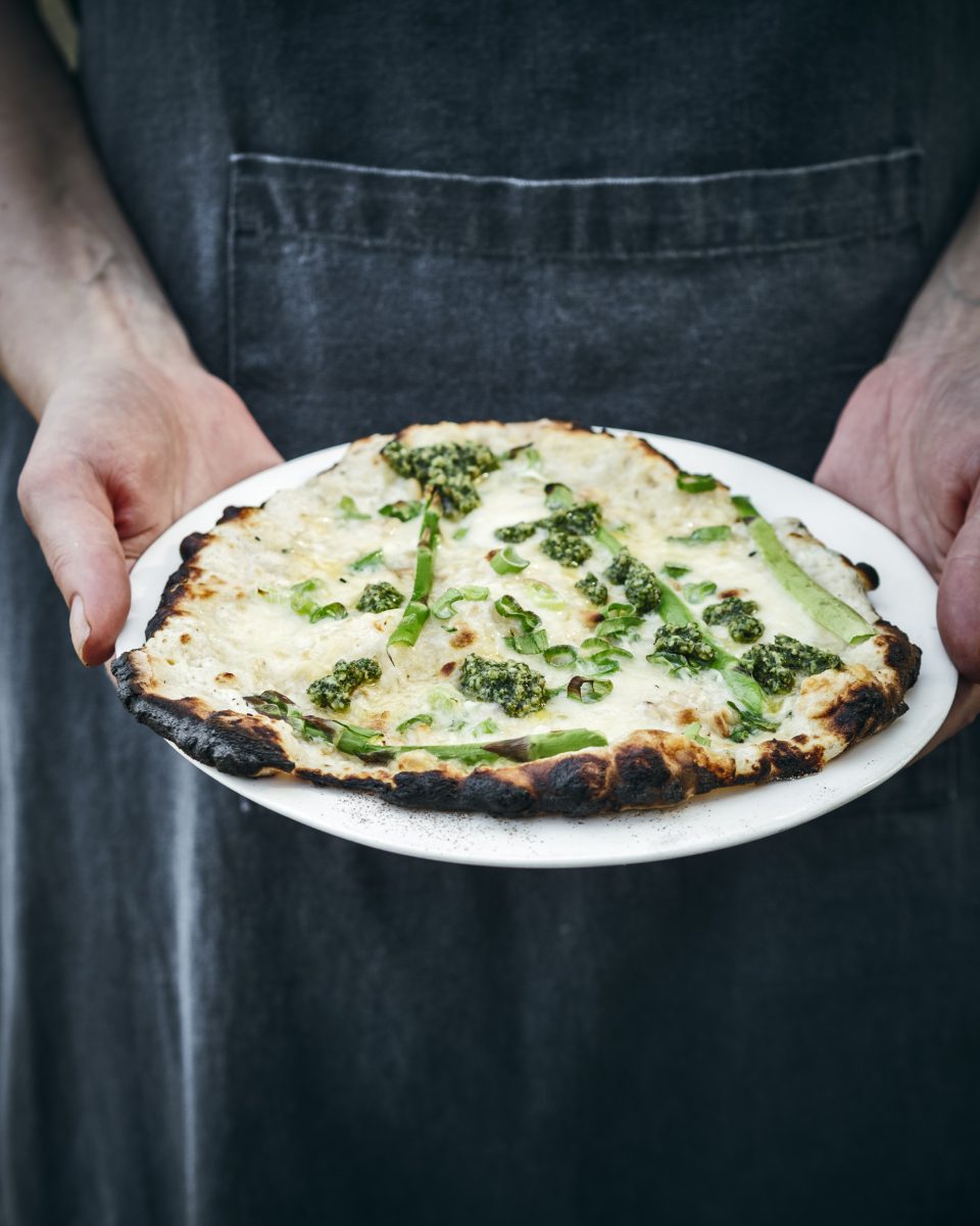 - Schep wat brandnetelpesto op de pizza’s. Snijd de mozzarella in plakjes en verdeel over de pizza’s. Verdeel de asperges over de mozzarella en bestrooi met geraspte Parmezaanse kaas en pijnboompitten.