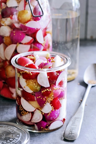 Radijzen zijn vaak de eerste en laatste bewoners van de moestuin. Vroege vogels die snel ontkiemen in de volle grond en dapper volhouden tot de winter. In feestelijke kleuren én veel verschillende smaken: proef ze rauw of geroosterd, of verwerkt tot pittige pickle. Voor 1 pot van circa 300 milliliter Wat heb ik nodig? 1 bosje radijsjes 1 theelepel zout 125 milliliter witte-wijnazijn 65 milliliter water 20 gram suiker 2 theelepels mosterdzaad Hoe maak ik het?
