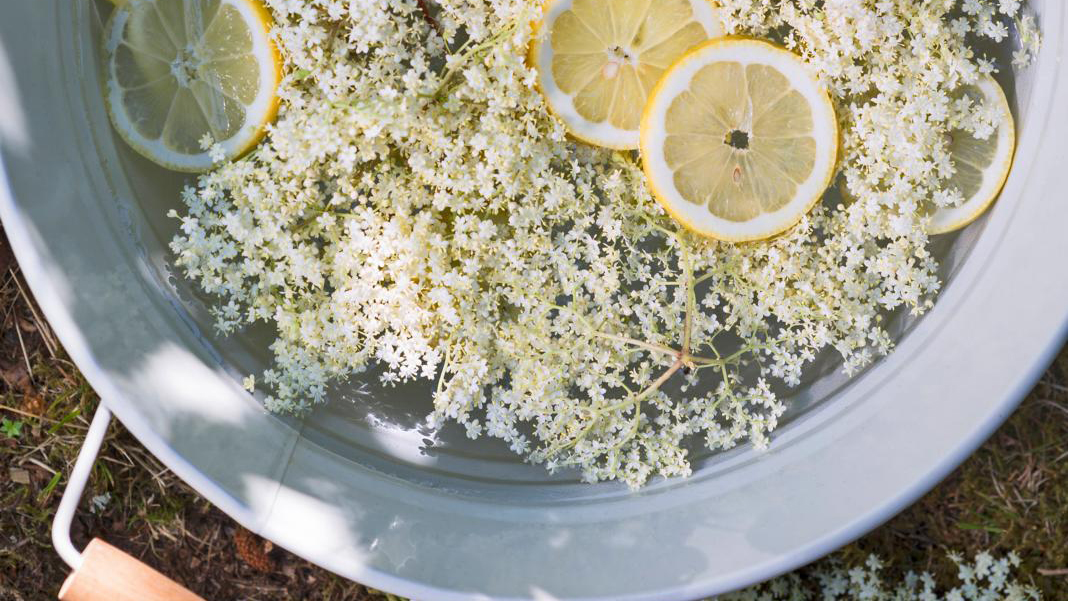 - Doe zo veel mogelijk schermen (zonder takjes) in een grote teil en zet net onder water samen met wat schijfjes citroen voor de vlierbloesemsiroop.