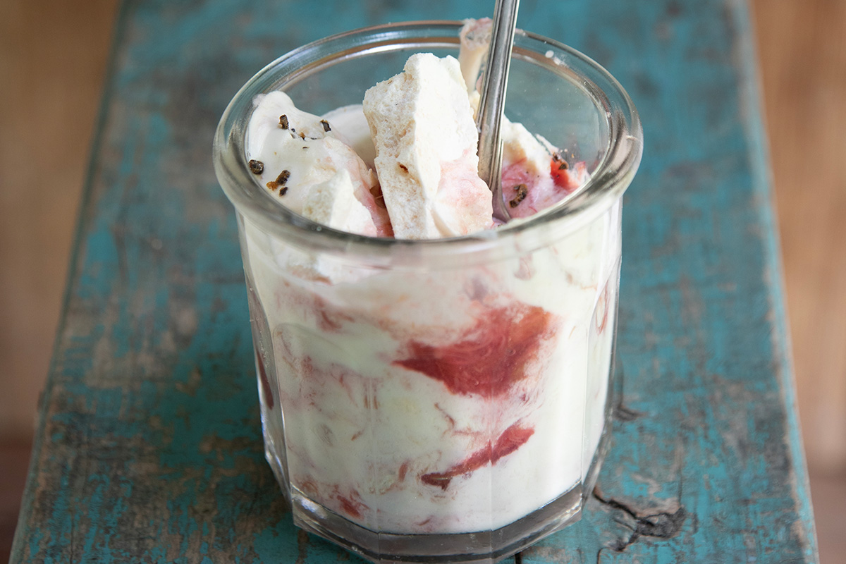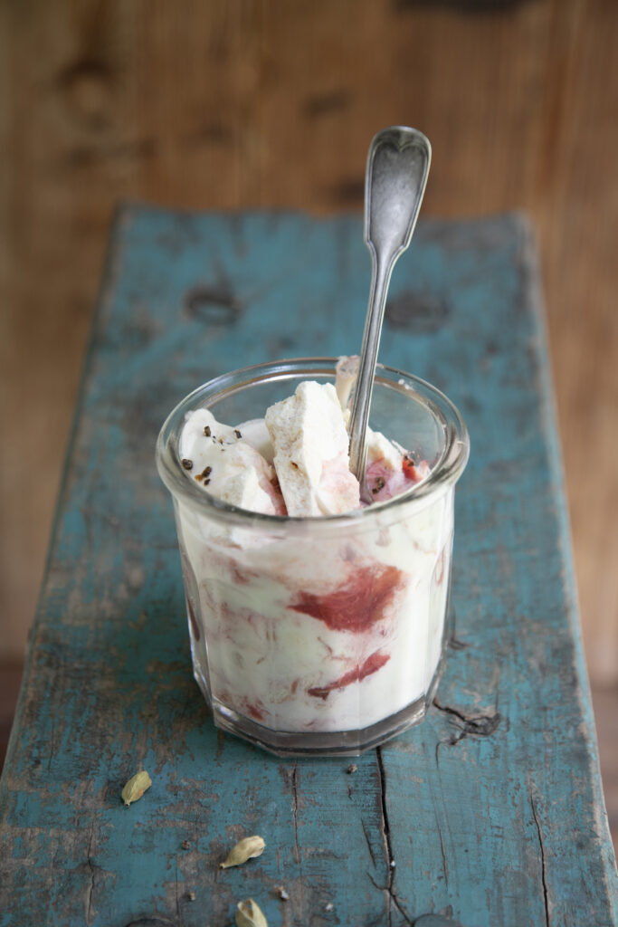 Dit nagerecht is geïnspireerd op Eton mess, een typisch Engels toetje. Het verhaal gaat dat het is ontstaan uit een mislukt dessert. Om toch iets op tafel te kunnen zetten, werden alle onderdelen door elkaar heen geserveerd en dat bleek heerlijk. Meringue kun je kant-en-klaar kopen, maar zelf maken is echt gemakkelijk. Zo maak je zelf romige yoghurt en rabarber met honing mess en kardemom.