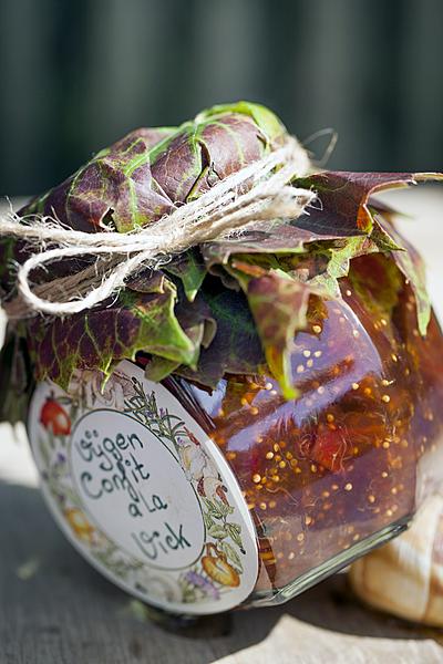 - Schenk de hete confit meteen in een goed schoongemaakt en gesteriliseerd potje en sluit af. Laat het potje circa 5 minuten op de kop staan. Vouw een vijgenblad over de deksel en bind vast met een mooi stukje touw.