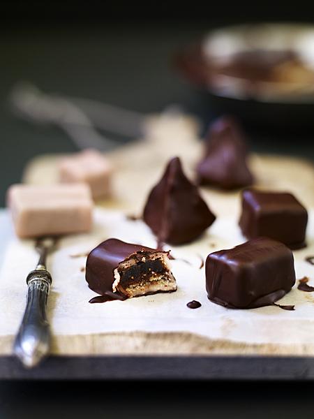 - Leg de bonbon op een dunne, smalle vork en overgiet ’m met gesmolten chocolade of schep door de chocolade. Schuif de bonbon voorzichtig van de vork op bakpapier en laat de chocolade stollen op een koele plaats.