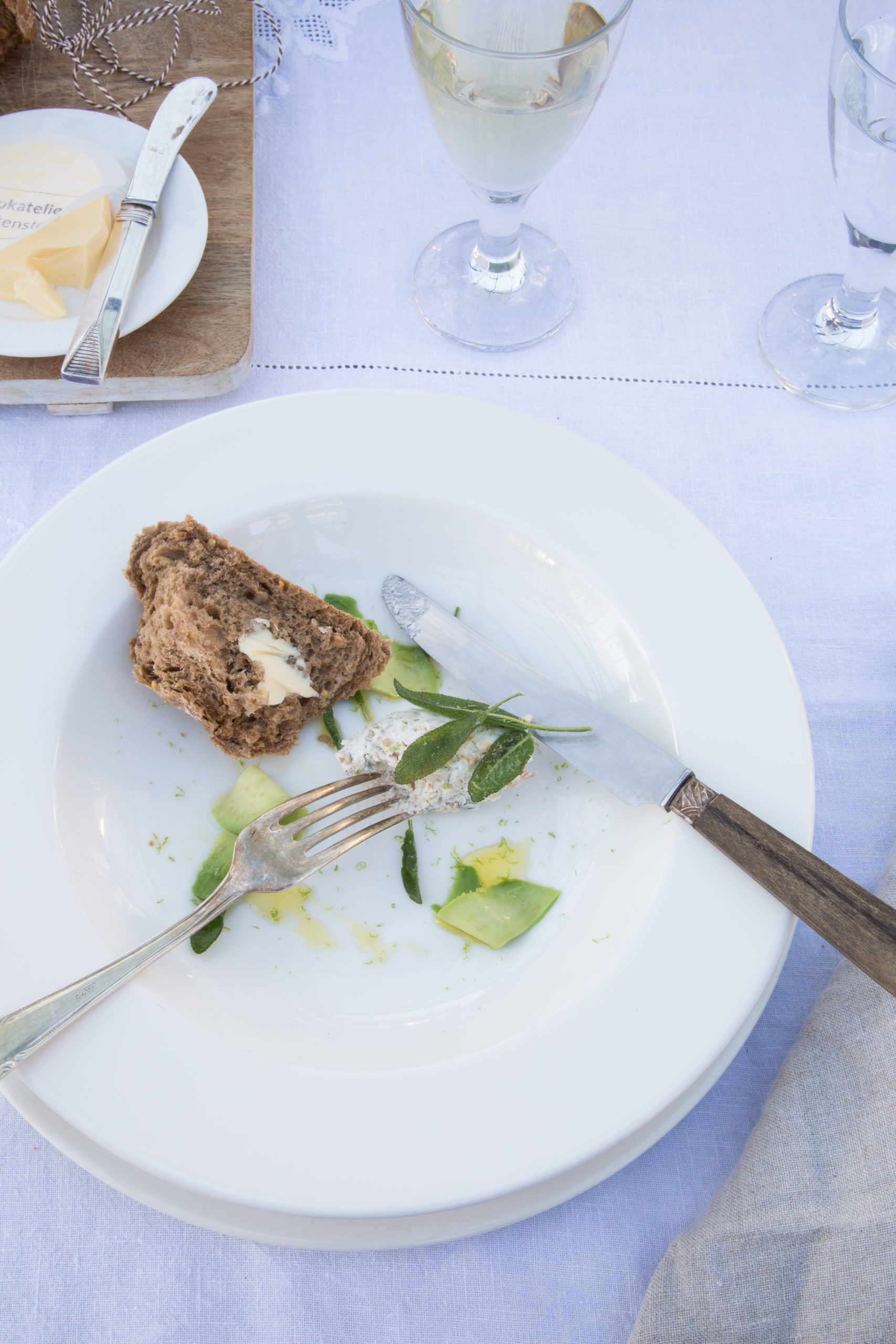 - Vorm met 2 eetlepels 4 quenelles van de geitenkaas en leg die op de borden.