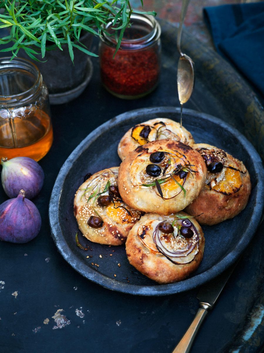 - Schil en snijd de sinaasappels en de rode ui in dunne plakjes. Snijd de kaas ook in plak- jes en beleg de ronde broden in laagjes met kaas, ui, sinaasappels en de kruiden. Besprenkel met de rest van de olijfolie en honing en strooi het zout en sesamzaad erover.
