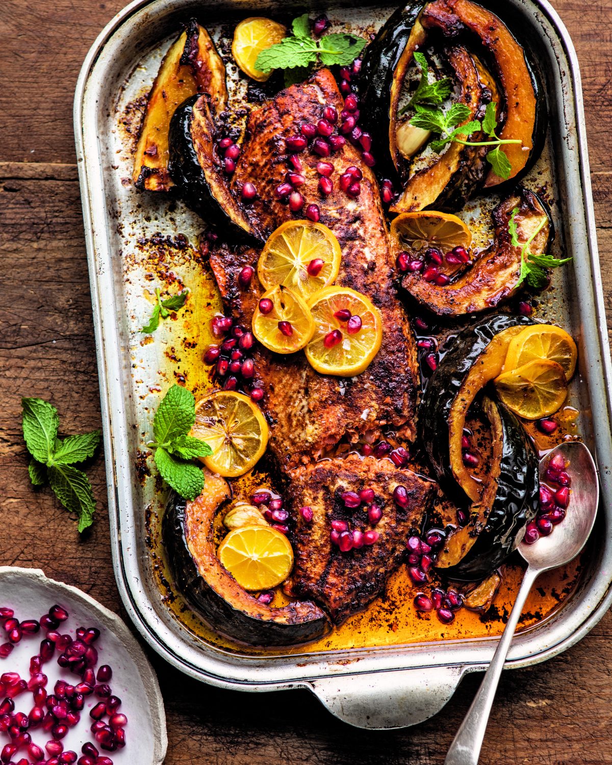 - Verdeel de zalm in zes stukken en schep de zalm en pompoen op zes borden. Strooi er granaatappelpitten en muntblaadjes over.